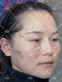 注射之前淚溝明顯,額角凹陷、太陽(yáng)穴凹陷、臉頰凹陷,右圖畫(huà)出需要治療部位。