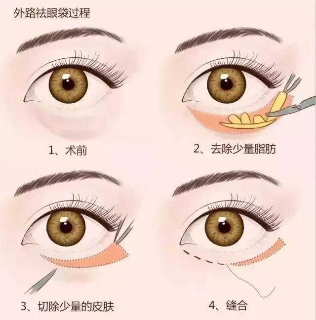 外切祛眼袋:適用于伴有下瞼皮膚和肌肉松弛、眶隔脂肪脫垂或者眼輪匝肌肥厚等的各種下瞼組織老化者。如有“淚溝”者,可同時行眶隔脂肪釋放填充。