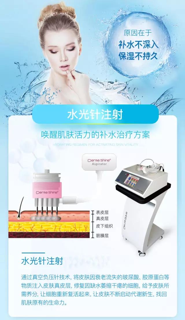 產(chǎn)品的水光注射不是單針注射治療,而是通過水光注射設(shè)備給皮膚仿真層輸入透明質(zhì)酸。