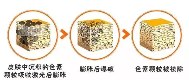 利用使激光能量集中作用于淺、中、深層的色素顆粒上,分層次將色斑直接擊碎,再通過血液和淋巴組織排出體外。