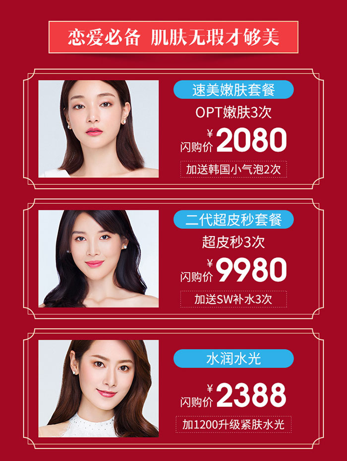 【速美嫩膚套餐】解除危“肌”預(yù)警,讓你輕松悅享美麗新??;【二代超皮秒套餐】這一“秒”,讓你實(shí)力素顏不加“斑”;【水潤(rùn)水光】肌膚喝飽水,素顏也發(fā)光。2021,成美麗焦點(diǎn),赴青春之約!