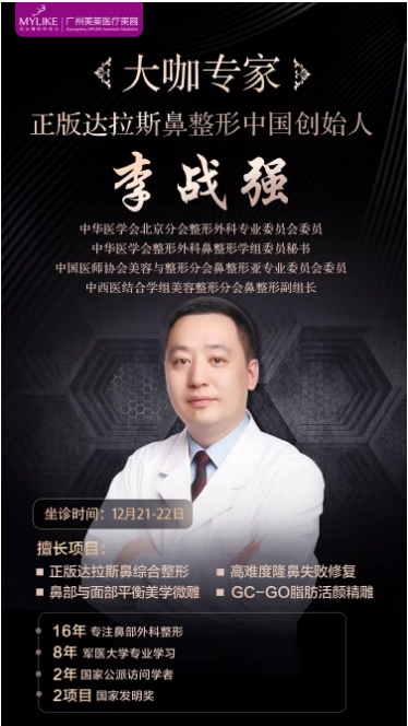 12月21-22日,站立世界之巔的鼻整容醫(yī)師李戰(zhàn)強(qiáng)教授坐診廣州美萊,為愛(ài)美者全心打造專(zhuān)屬靈韻美鼻!